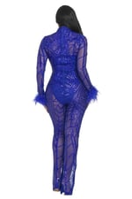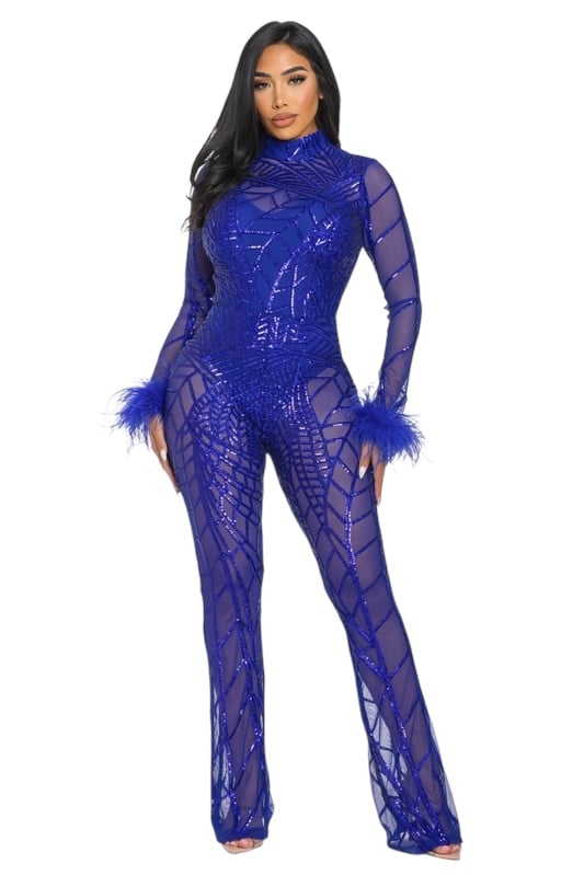 Shine in the stunning blue sequence jumpsuit. Perfect for a special occasion, this piece offers a glamorous look with it design and feather cuffs.