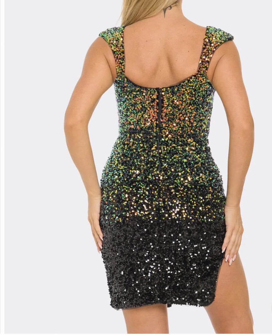Stunning multicolor sequin dress with a sleeveless design. Perfect for parties and special occasions.