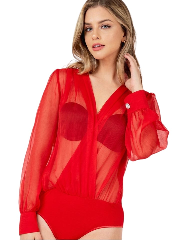 Elevate your style with the stunning red wrap top. Perfect for any occasion, this top offers a flattering fit and vibrant color. Out of shell hundred percent polyester contrast 95% rayon 5% spandex
